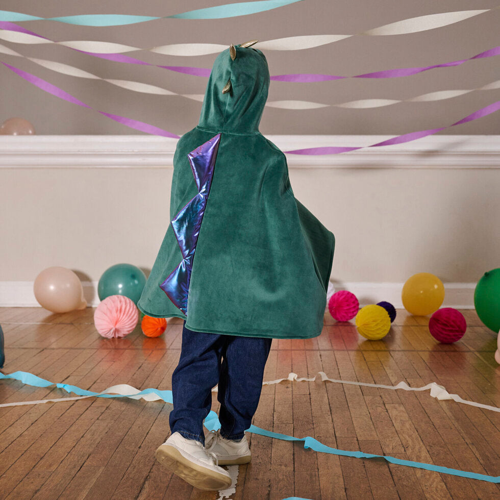 Let your imagination roarrrr with our fun Dinosaur Velvet Cape! Made in super soft velvet and adorned with gorgeous embroidery and iridescent spikes. Each cape has a detailed hood and is fully lined for added comfort! The perfect addition to imaginative play, or a fun addition to the dressing up box. Totally roar-some!